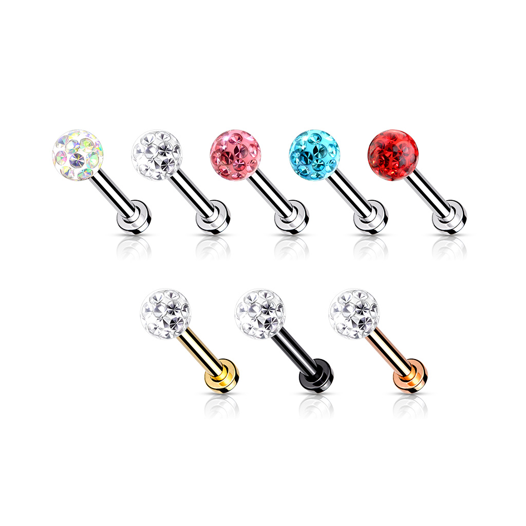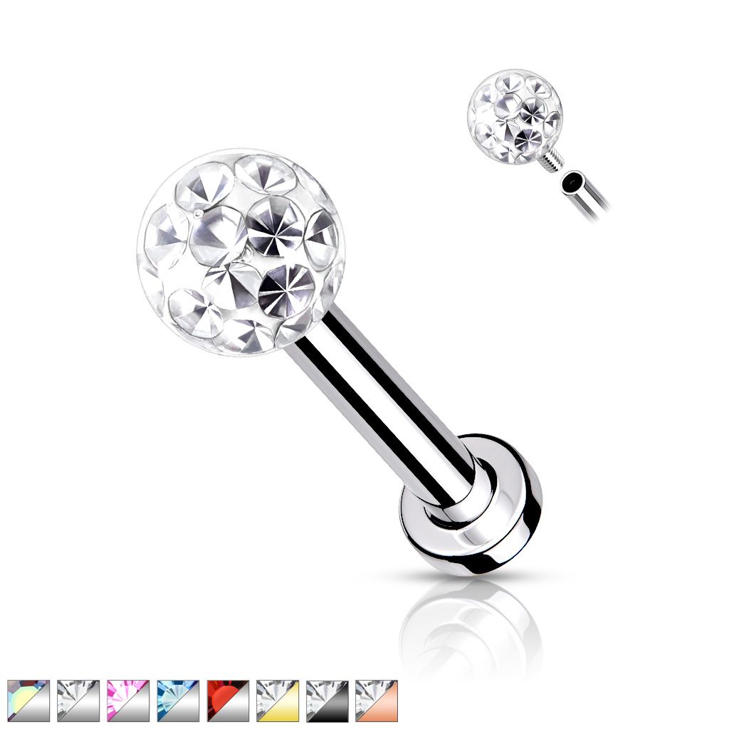 Barra de piercing - labret- em aço cirurgico 316L , para cartilagem ou boca (Labret, Monroe), com bola epoxy cravada de cristais e rosca interna LSI012