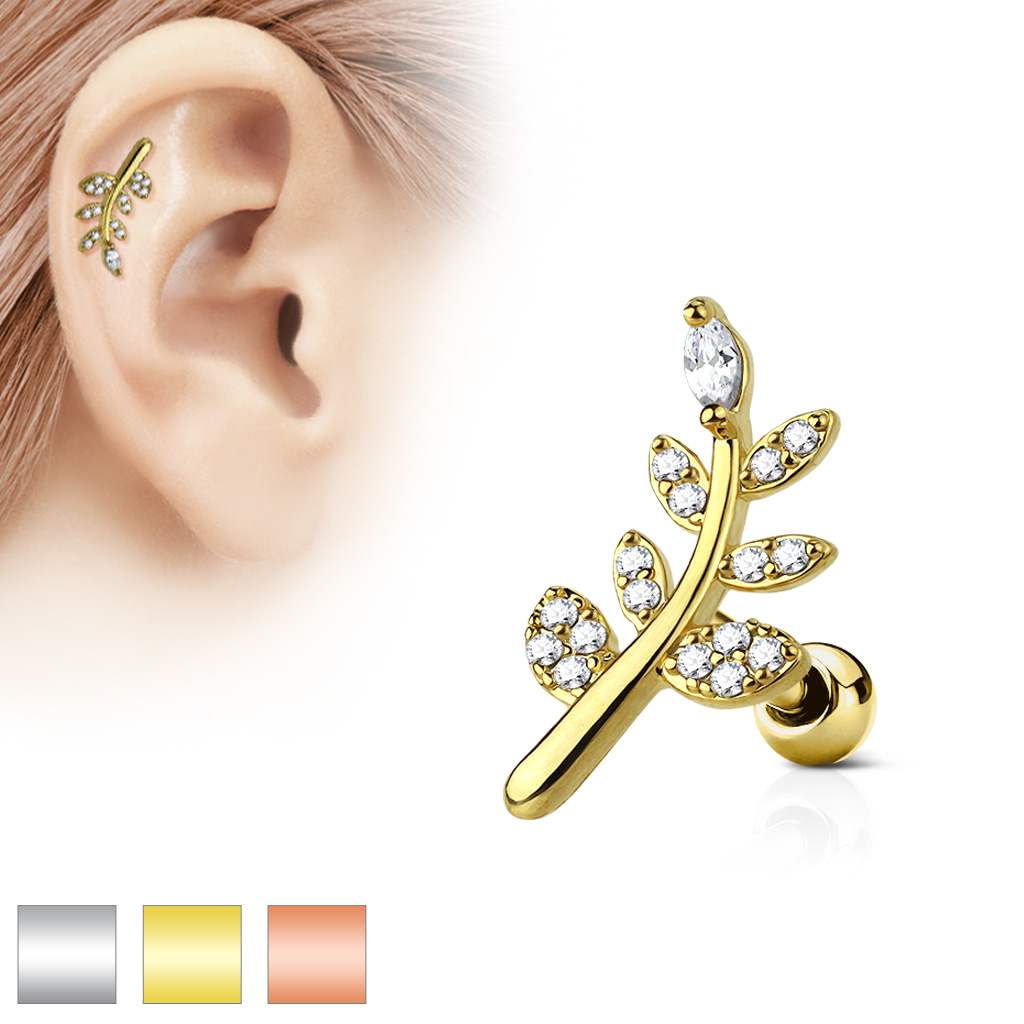 Body piercings - barra pequenina em aço cirúrgico 316L com ramo de bronze lacado e cristais zirconia..