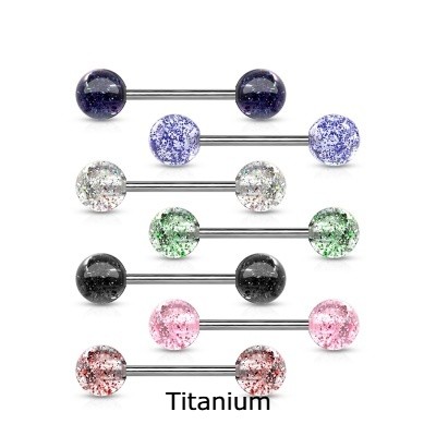 Joia barra de Titanio para piercing de lingua com bolas de acrilico purpurina T23BL2