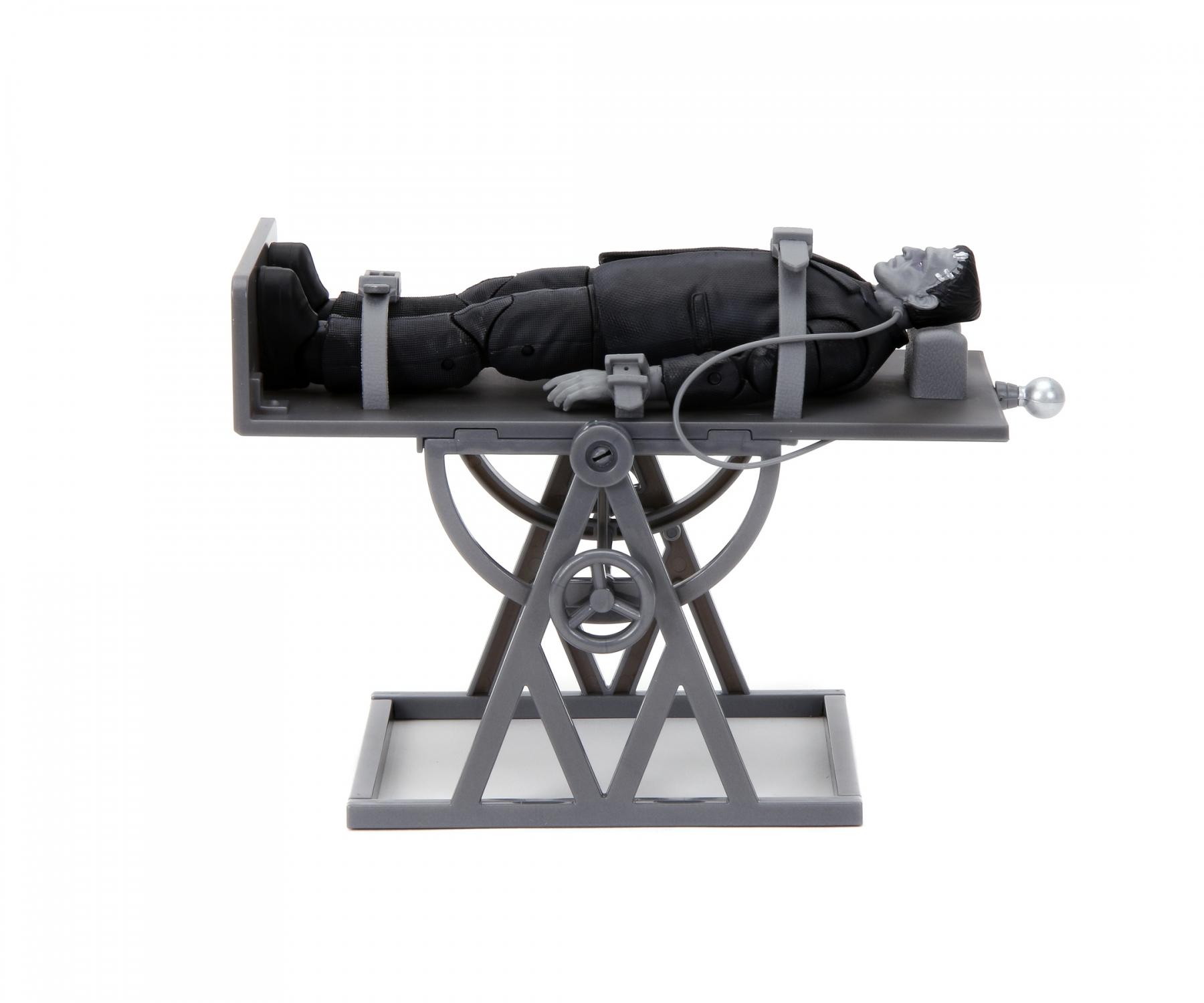 Comemore o 90º aniversário cinematográfico do Monstro de Frankenstein com este item colecionável exclusivo de edição limitada. O Monstro de Frankenstein é esculpido em um espetacular preto e branco, homenageando este venerável e incompreendido ícone da Universal Studios. Assim como o Monstro de Frankenstein é composto por muitas partes, este conjunto vem com peças exclusivas que o tornam uma verdadeira peça de colecionador. A mesa cirúrgica, reconhecível e totalmente funcional, inclui cintos, apoio para os pés, bloco de cabeça, fiação elétrica e uma capa de tecido para a mesa de laboratório. Os acessórios incluem cabeça, mãos e acessórios extras.